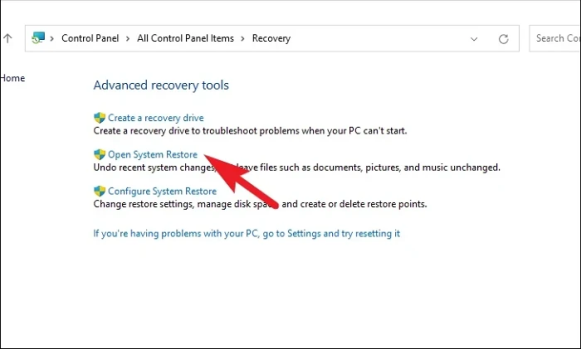 Далее выберите из списка пункт «Открыть восстановление системы». Это откроет отдельное окно на вашем экране.