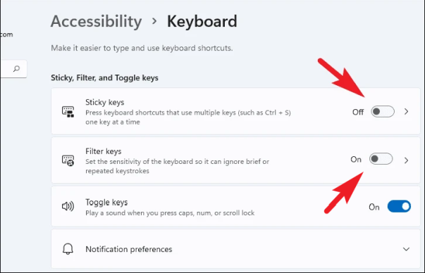 Затем отключите переключатель рядом с параметром «Залипание клавиш». Аналогичным образом отключите переключатель для параметра «Ключи фильтра».