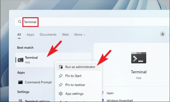 Сначала перейдите в меню «Пуск» и введите «Терминал», чтобы выполнить поиск. Затем в результатах поиска щелкните правой кнопкой мыши плитку «Терминал» и выберите параметр «Запуск от имени администратора».