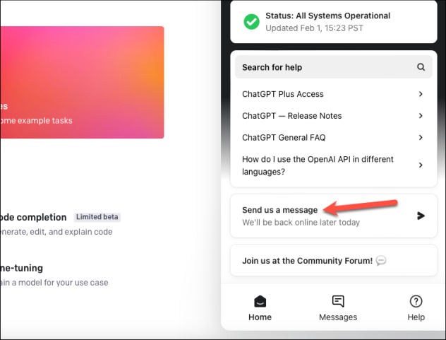 Панель справки OpenAI откроется в правом нижнем углу. Нажмите «Отправить нам сообщение».