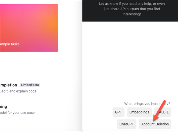Отправьте электронное письмо deletion@openai.com из учетной записи, которую вы хотите удалить. Тема письма должна быть «Запрос на удаление учетной записи», а в теле письма добавить «Пожалуйста, удалите мою учетную запись».