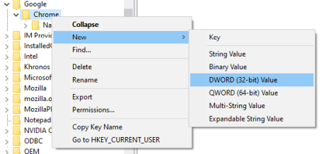 Затем щелкните правой кнопкой мыши кнопку Chrome, чтобы создать последнее 32-битное значение DWORD.