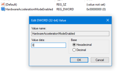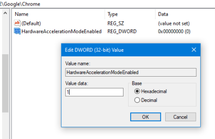 Теперь вам нужно переименовать это значение в «HardwareAccelerationModeEnabled». Включите или выключите аппаратное ускорение в Chrome, установив значение 0 или 1.