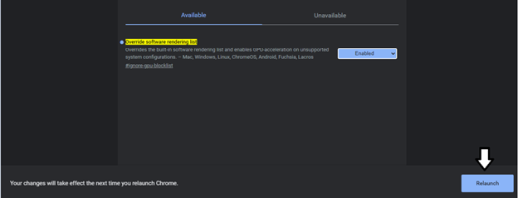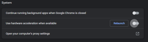 Проверьте наличие параметра «Использовать аппаратное ускорение, когда доступно» после выбора System. Там же находится переключатель включения/выключения. Переключатель обычно находится на стороне «ON». Переведите переключатель в положение «ВЫКЛ.», а затем нажмите «Перезапустить», чтобы применить изменения.
