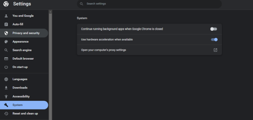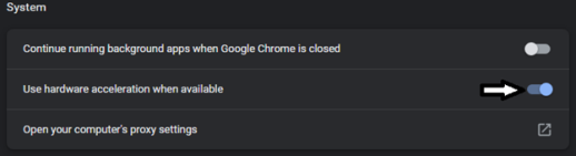 Проверьте наличие параметра «Использовать аппаратное ускорение, когда доступно» после выбора System.