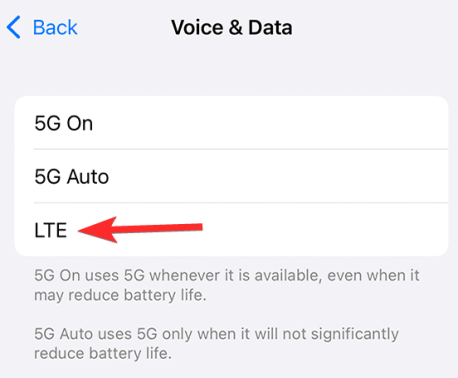 Ну это тоже просто. Просто воспользуйтесь приведенным выше руководством, чтобы перейти в «Настройки» > «Мобильные данные» > «Параметры мобильных данных» > «Голос и данные», а затем выберите LTE (как показано ниже).