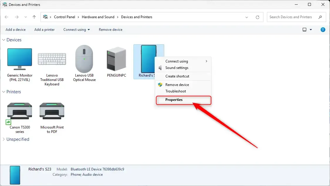 Затем выберите и щелкните правой кнопкой мыши устройство, которое хотите переименовать, и выберите «Свойства» в контекстном меню.