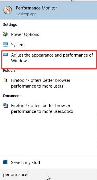 2. Нажмите «Настроить внешний вид и производительность результатов поиска Windows», чтобы открыть «Параметры производительности».