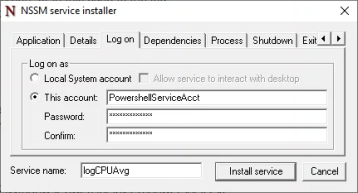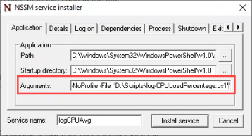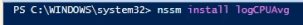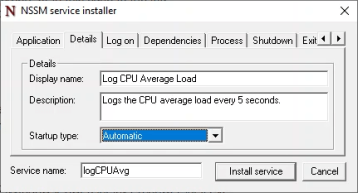 2. Введите команду nssm install logCPUAvg и запустите ее. Откроется окно установщика службы NSSM.