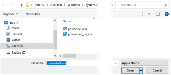 3. Нажмите кнопку с многоточием рядом с полем «Путь:» и перейдите к файлу powershell.exe, который обычно находится в папке C:WindowsSystem32. Выберите powershell.exe. Путь: и каталог запуска: поля будут автоматически заполнены.