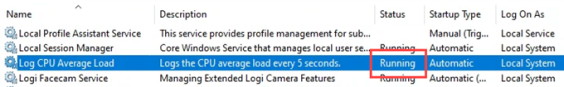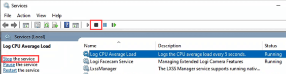 1. В диспетчере служб Windows остановите службу. Сделайте это, выбрав службу «Журнал средней загрузки ЦП», а затем либо нажав квадратную кнопку остановки на панели инструментов, либо ссылку «Остановить службу» слева.