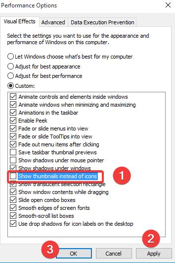 Вот как отключить миниатюры файлов с помощью конфигураций Визуальные эффекты: