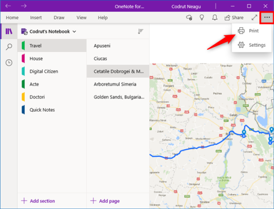 Приложения из Microsoft Store в Windows 10 обычно включают кнопку «Настройки и многое другое» (…) или кнопку «гамбургер» (☰). Его часто помещают в верхнем левом или правом углу. Если вы щелкните или коснитесь его, откроется меню с параметрами, которые должны включать Печать. Ниже вы можете увидеть снимок экрана из приложения OneNote для Windows 10.