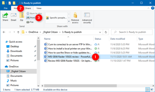 Если вы установили и настроили принтер по умолчанию, вы можете печатать документы и изображения прямо из проводника . В Windows 10 откройте проводник и перейдите к файлу, который хотите распечатать. Выберите его и перейдите на вкладку «Поделиться» на ленте. В группе «Отправить» нажмите или коснитесь кнопки «Печать».