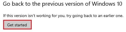 - В разделе « Вернуться к предыдущей версии Windows 10» нажмите «Приступить к работе».
