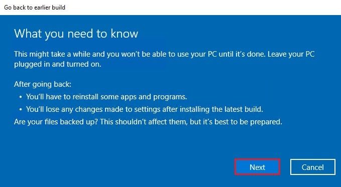 Обратите внимание, что откат к предыдущей сборке приведет к отмене любых изменений, внесенных в компьютер, включая настройки, персонализацию, установку или удаление приложений и т.д. в течение этого периода.