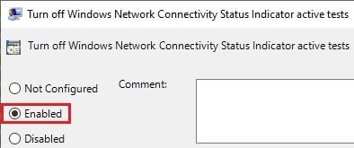 - На правой панели дважды щелкните Отключить активные тесты индикатора состояния сетевого подключения Windows, а затем выберите Включено . Щелкните ОК.
