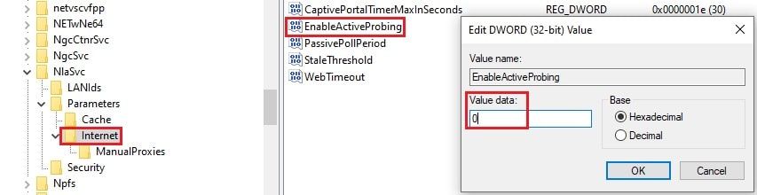 HKEY_Local_Machine -> System -> CurrentControlSet -> Services -> NlaSvc -> Parameters -> Internet - Теперь дважды щелкните EnableActiveProbing на правой панели и установите для параметра Value Data значение 0.