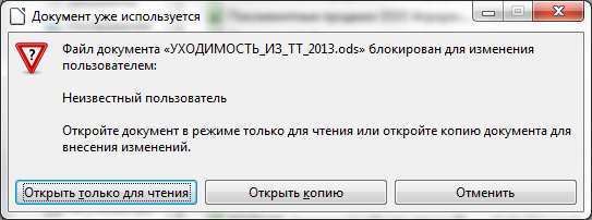 LibreOffice 4.0.6 взамен OpenOffice 3.2 вдруг появился интересный глюк, выражающийся в невозможности открытия некоторых документов для редактирования (очень маленький процент из общей массы, на вскидку, 1 документ из 100), аргументируя это тем, что данный документ уже кем-то открыт, что не является правдой. Дословно: «Файл документа блокирован для изменения пользователем: Неизвестный пользователь».