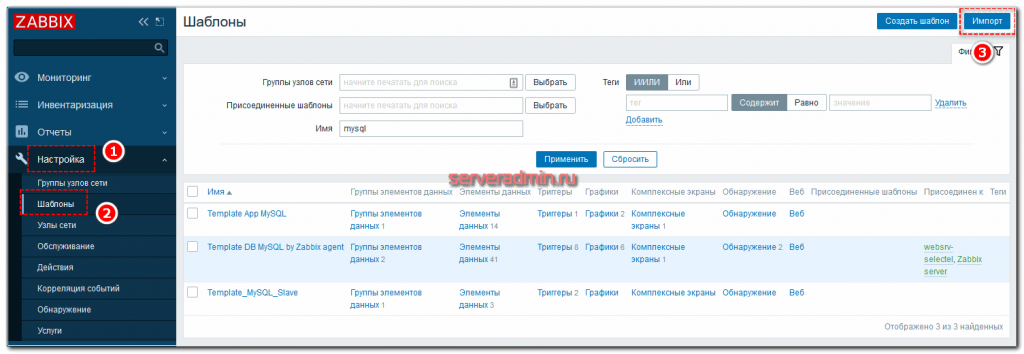 В веб интерфейсе идем в раздел Настройка -> Шаблоны и импортируем шаблон template_db_mysql_agent.xml.