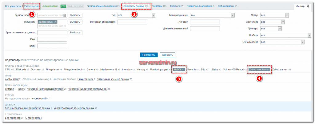 Ждем несколько секунд и переходим на вкладку Элементы данных. Фильтруем элементы по названию группы MySQL и Zabbix raw items.