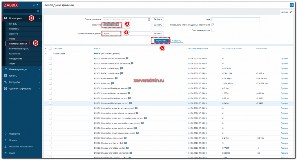 После этого идем в раздел Мониторинг -> Последние данные и наблюдаем собираемые метрики.