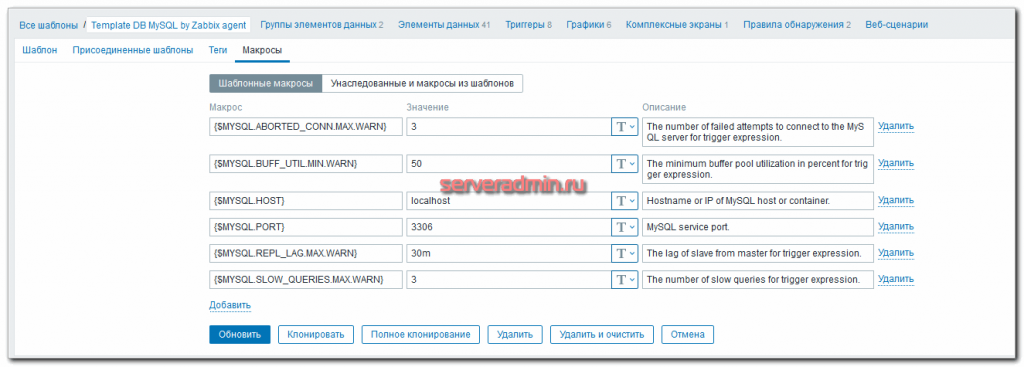 Вообще, шаблон достаточно навороченный. Там и автообнаружение, и зависимые элементы с предобработкой xml, и предобработка с помощью JavaScript. Рассмотрю отдельно некоторые моменты представленного шаблона zabbix по мониторингу mysql. Во-первых, некоторые параметры задаются с помощью макросов. Вот их список.