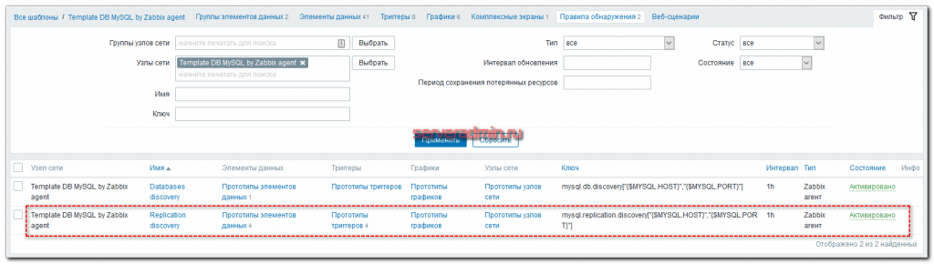Так же в шаблоне реализован мониторинг репликации базы данных. Для этого есть отдельное правила автообнаружения с триггерами. Теперь моя старая статья по мониторингу репликации mysql стала не актуальна. Этот же функционал реализован в базовом шаблоне. Если у вас не настроена репликация, то автообнаружение просто не найдет ничего. Можно это правило выключить.
