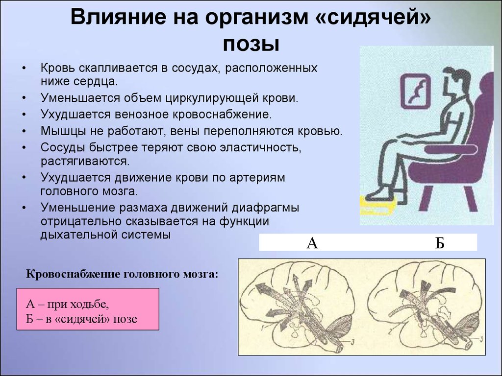 Обратите внимание: Гиподинамия – это прямой путь к болезням сердечно-сосудистой системы и нарушениям кровообращения. Отрицательное влияние малоподвижности на человеческий организм проявляется, в частности, в ослаблении сердечных мышц и дисфункции кровотока.