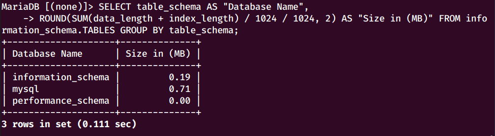 # mysql -u root -pMariaDB [(none)]> SELECT table_schema AS «Database Name»,ROUND(SUM(data_length + index_length) / 1024 / 1024, 2) AS «Size in (MB)»FROM information_schema.TABLESGROUP BY table_schema;