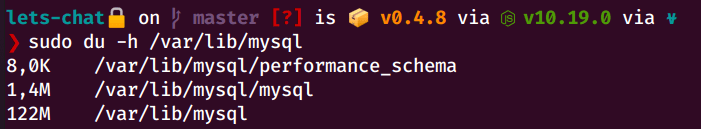 Наконец, чтобы узнать фактический размер всех файлов базы данных MySQL на диске (файловой системе), запустите команду du приведенную ниже: