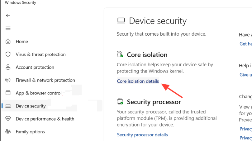 В окне «Безопасность Windows» нажмите «Безопасность устройства» на левой боковой панели.