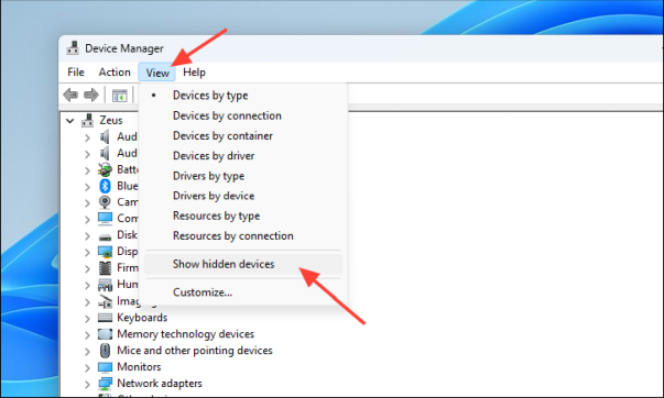 Перейдите на вкладку «Вид» и выберите «Показать скрытые устройства» в окне «Диспетчер устройств».