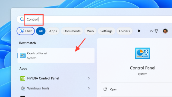 Откройте меню «Пуск» и введите «Панель управления» в поле поиска. Нажмите «Панель управления» в результатах поиска.