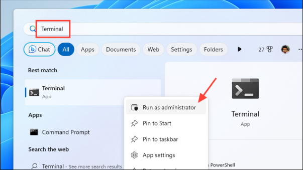 Откройте меню «Пуск» и введите «Терминал». В результатах поиска щелкните правой кнопкой мыши параметр «Терминал» и выберите «Запуск от имени администратора».