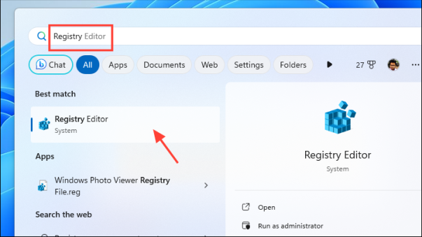 Откройте меню «Пуск» и найдите «Реестр». В результатах поиска нажмите «Редактор реестра».