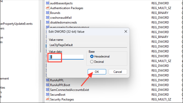 В окне свойств «LsaCfgFlags» введите 0 в поле «Значение данных».