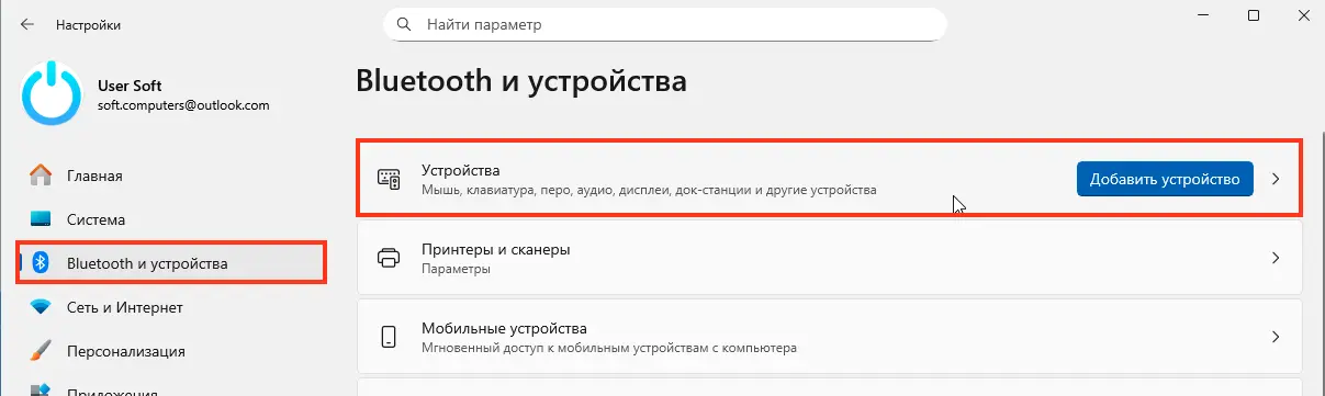 2. Если переключатель не реагирует – перейдите в «Параметры» → «Bluetooth и устройства» → «Устройства».