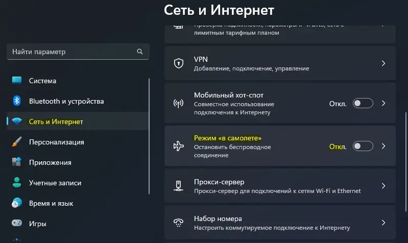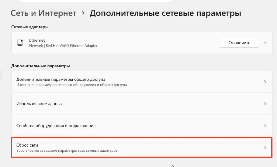 Это перезапустит модуль. Также можно сделать общий сброс сети: «Параметры» → «Сеть и Интернет» → «Дополнительные параметры сети» → «Сброс сети».