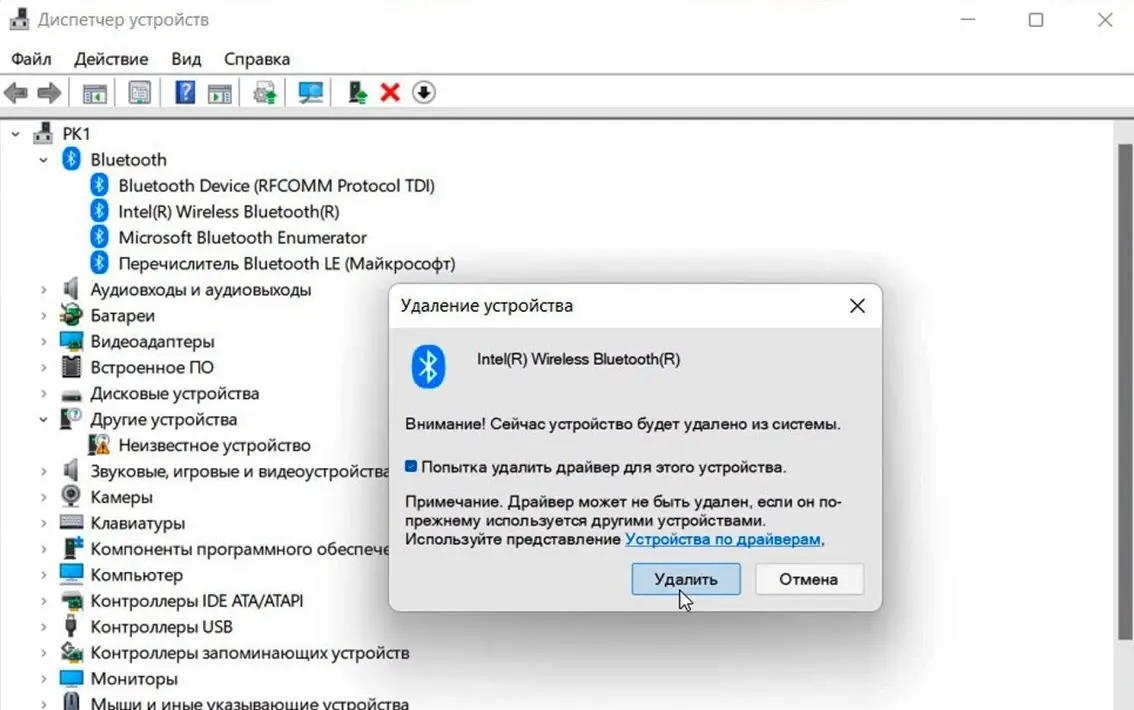 – Удалите старые сопряжённые устройства: «Параметры» → «Bluetooth и устройства» → «Устройства» → удалить ненужные.