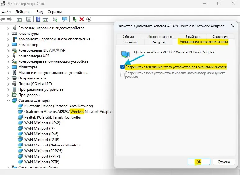– Вкладка «Управление электропитанием» → снимите галочку «Разрешить отключение устройства для экономии энергии».