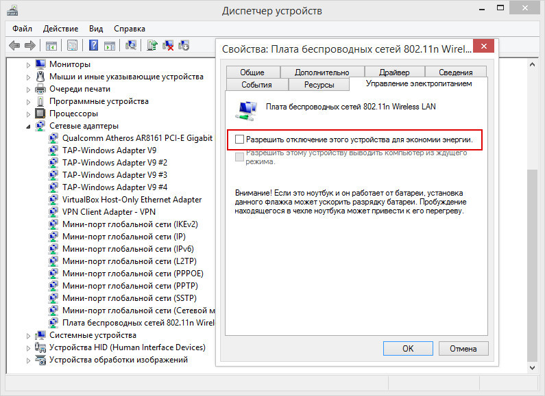 Найдите его в Диспетчере устройств, откройте его свойства, переключитесь на вкладку «Управление электропитанием» и снимите там птичку с пункта «Разрешить отключение этого устройства для экономии энергии».