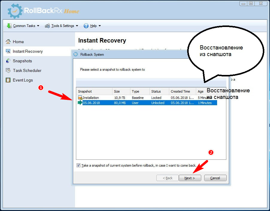 А вот в случае с указанием на запущенный в системе антивирус выполнить откат к предыдущей точке восстановления нам не удалось даже из-под загрузочной среды восстановления. В конце концов пришлось прибегнуть к помощи сторонних инструментов — программе RollBack Rx Home Edition, представляющей собой альтернативу штатному компоненту Windows.