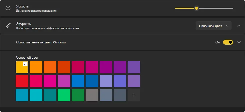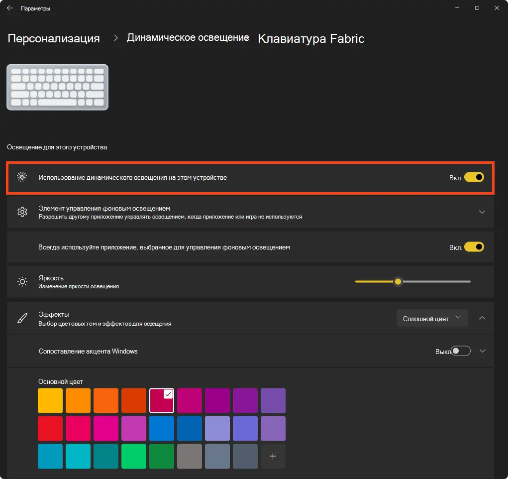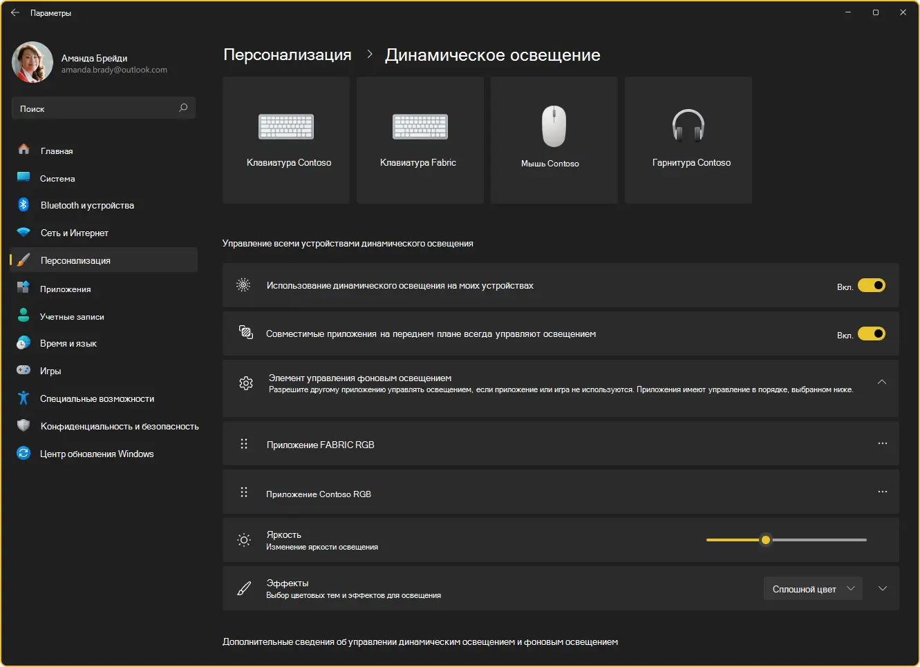 По умолчанию Windows применяет выбранный цвет и эффект ко всем совместимым устройствам сразу. Это удобно, если хотите, чтобы вся периферия светилась одинаково.