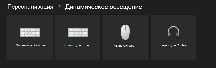 Ниже в окне «Динамическое освещение» отображаются карточки отдельных устройств. Нажмите на карточку — и вы сможете выбрать отдельный цвет или эффект только для этого устройства. Индивидуальные настройки имеют приоритет над глобальными.