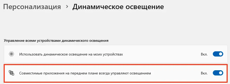 Включите опцию Совместимые приложениям на переднем плане всегда управляют освещением. Это полезно для игр и программ, которые могут динамически менять подсветку (например, подсвечивать клавиши действия в шутере).