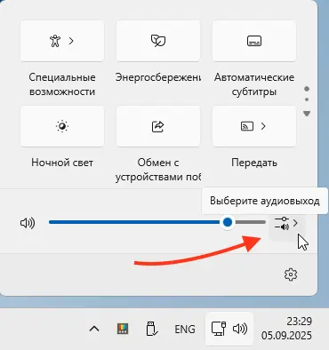 2. Кликните по значку громкости → выберите правильное устройство вывода.