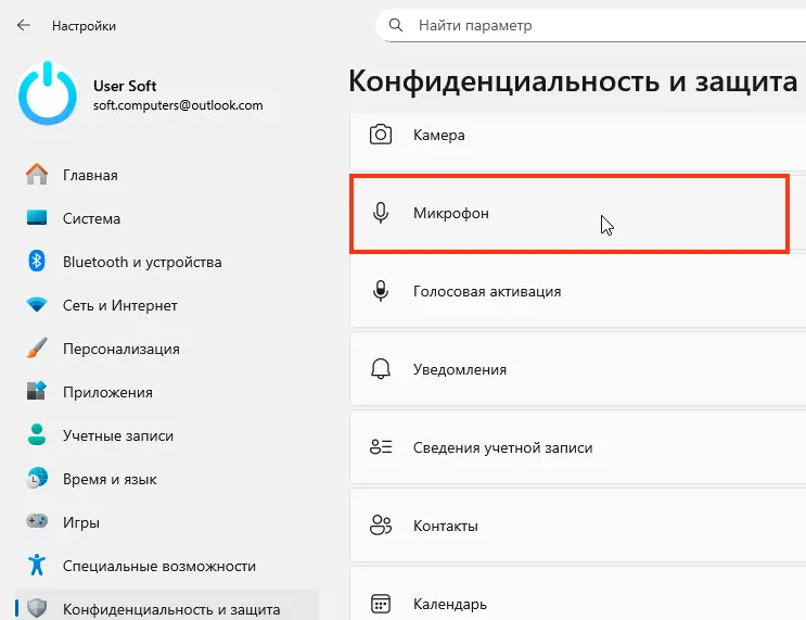 1. «Параметры» → «Конфиденциальность и защита» → «Микрофон».