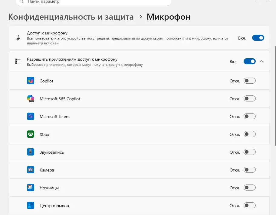 2. Убедитесь, что доступ к микрофону включён для системы и конкретных приложений.