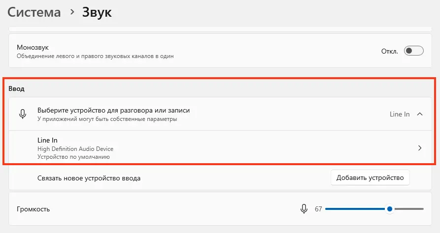 3. В разделе «Параметры звука» проверьте, что выбран правильный источник ввода.
